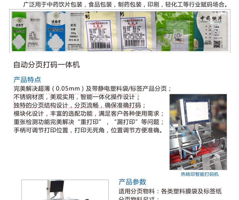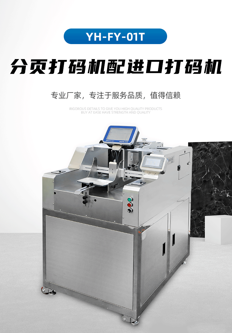 自动分页打码一体机是热转印打码技术与分页技术的全新融合,完美实现自动分页及热转印打印赋码;主要应用在塑料类材质(塑料包装袋/覆膜或上光油的纸张、标签等)上打印数字,字符,条码,二维码等信息的场合,特别···