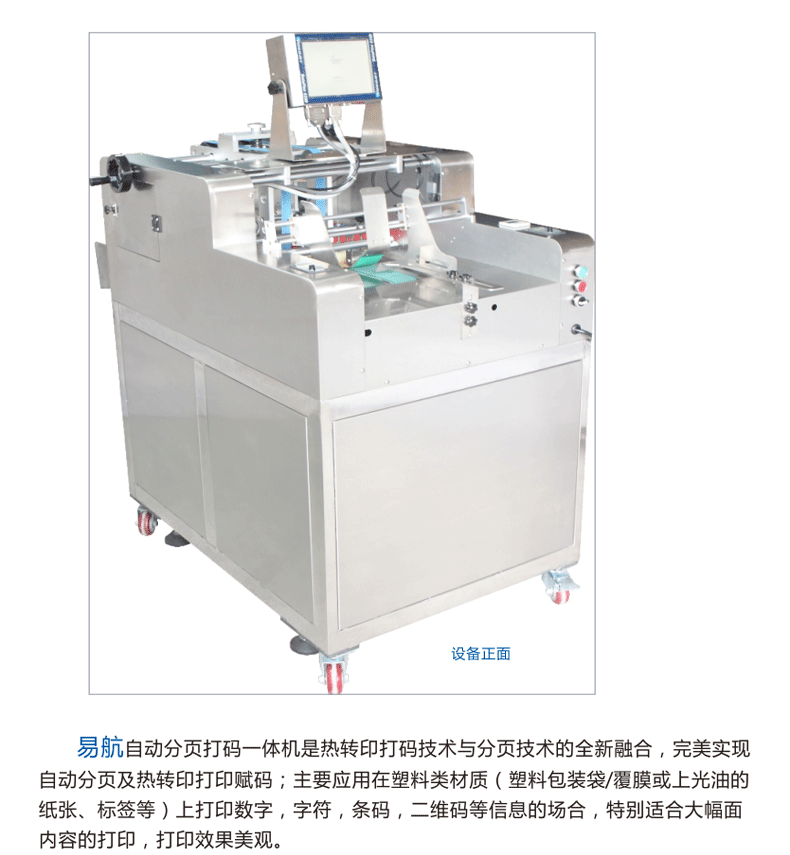 自动分页打码一体机是热转印打码技术与分页技术的全新融合,完美实现自动分页及热转印打印赋码;主要应用在塑料类材质(塑料包装袋/覆膜或上光油的纸张、标签等)上打印数字,字符,条码,二维码等信息的场合,特别适合大幅面内容的打印,打印效果美观。