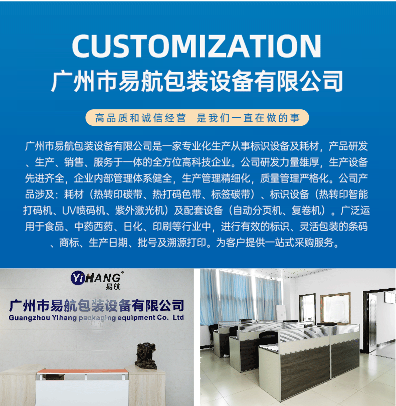 广州市易航包装设备有限公司是一家专业化生产从事标识设备及耗材,产品研发、生产、销售、服务于一体的全方位高科技企业。公司研发力量雄厚,生产设备先进齐全,企业内部管理体系健全,生产管理精细化,质量管理严格化。